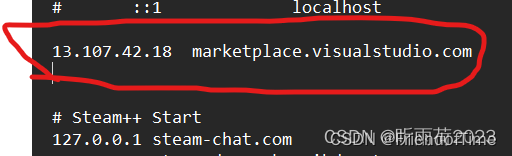 二、进入 C:\Windows\System32\drivers\etc ,找到hosts文件,用记事本打开,在任意一行写上 刚才的查询的ip地址+空格+连接不上的域名 (一定是你查出来的ip地址,这里我以13.107.42.18为例),可能需要管理员权限,保存,重新打开vscode。