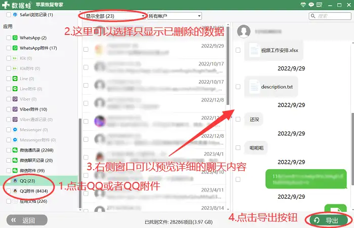 如何找回删除的qq聊天记录?数据 蛙苹果恢复专家提供针对苹果设备的QQ聊天记录恢复功能,除了支持扫描QQ聊天记录,还支持扫描微信、照片、文档、通讯录、备忘录等数据类型。使用专业软件恢复苹果手机上QQ的聊天记录,你可以按照以下步骤操作: