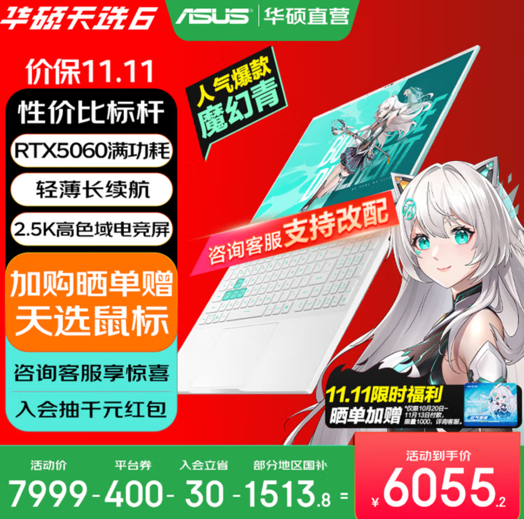 华硕天选6系列是2025年推出的高性价比游戏本,主打锐龙AI处理器与RTX 50系显卡组合,凭借国补政策成为中端市场热门选择。