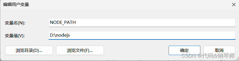 点击“环境变量”,在用户变量中点击“新建”,变量名输入NODE_PATH,变量值输入nodejs的地址。例如我在D盘新建了文件夹,命名为“nodejs”,将nodejs内容放入文件夹内。
