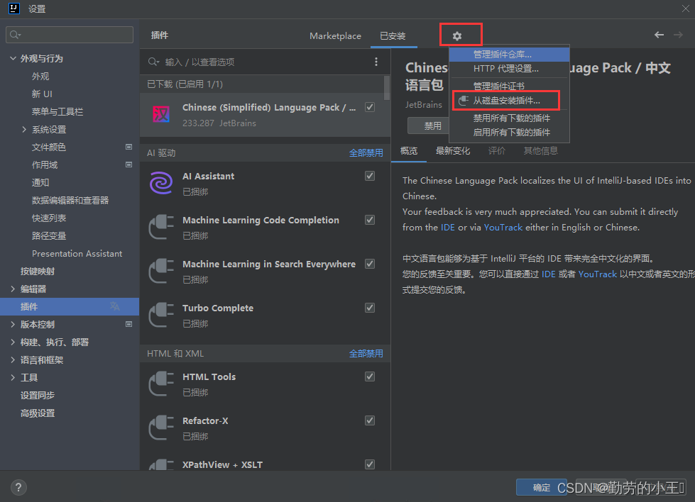 下载好后会得到一个压缩包,然后我们打开idea,还是第一步的操作:设置(settings)-->插件(plugins),然后点击右上方的小图标,之后选择从磁盘安装插件(Install plugin from disk),之后我们选择提前下载好的压缩包然后重启idea即可。