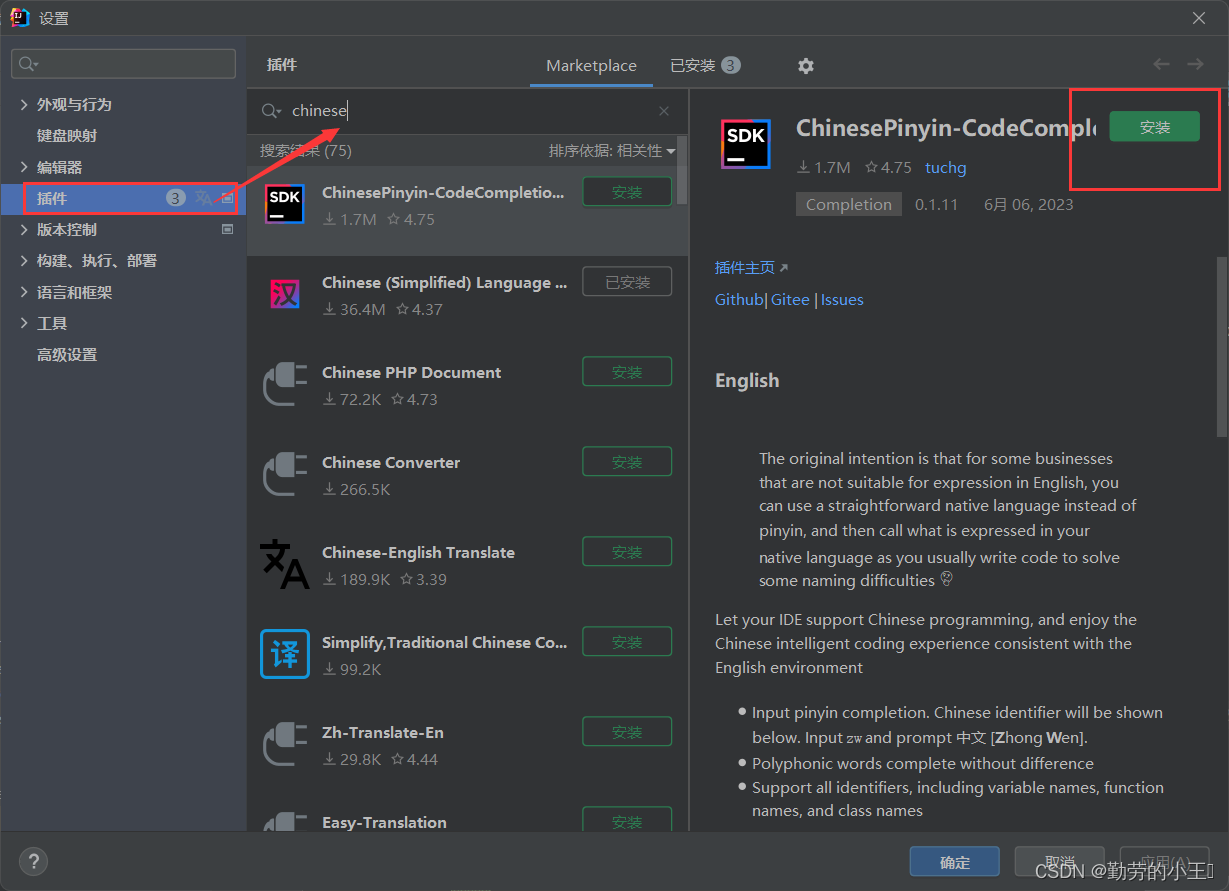 第一种方式就是在idea内直接下载,适合在联网环境下进行下载,在这我们拿chinese中文翻译插件为例子,操作步骤如下: