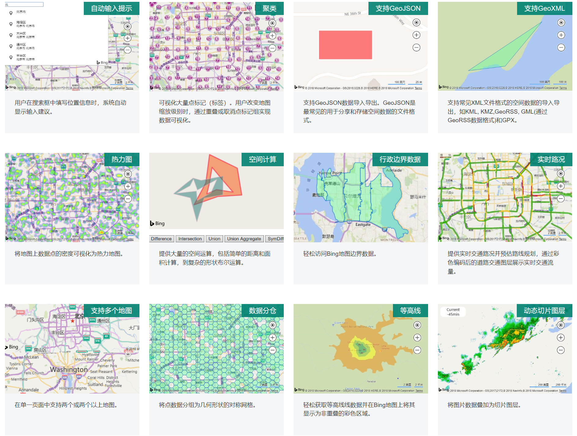 必应地图API我个人感觉其重心是在地图数据分析上。其官网并没有对定位、导航等基础地图应用需求有过多介绍,反而是对热力图、空间计算、聚类等空间分析算法加以一定篇幅的表述。对于需要涉及空间分析、地图数据计算等的应用需求,基于其API或许整体相对较为理想。