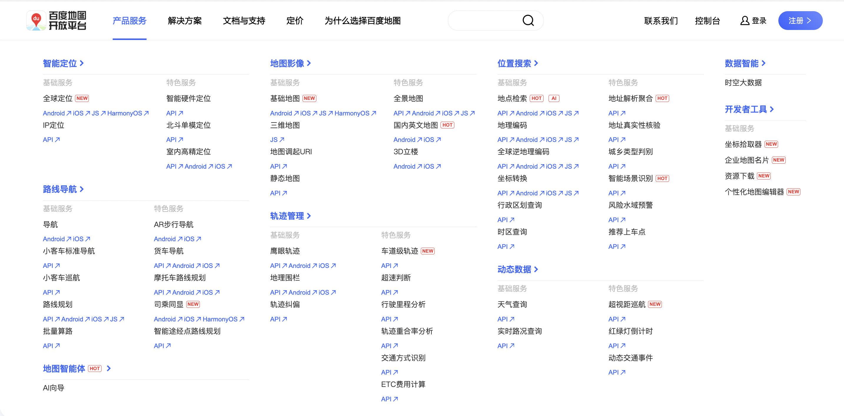 可以看到,百度地图开放平台的功能是几家中最丰富的,提供了包括定位、导航、遥感数据、轨迹、位置搜索、动态数据等地图服务工具;且还提供了具有智能分析作用的时空大数据模块、地图智能体等,是几家不同地图API中,对时空智能分析、AI技术等最早加以应用的厂商之一。总的来说,百度地图开放平台对于开发者而言可以说满足了几乎全部的地图服务需求。
