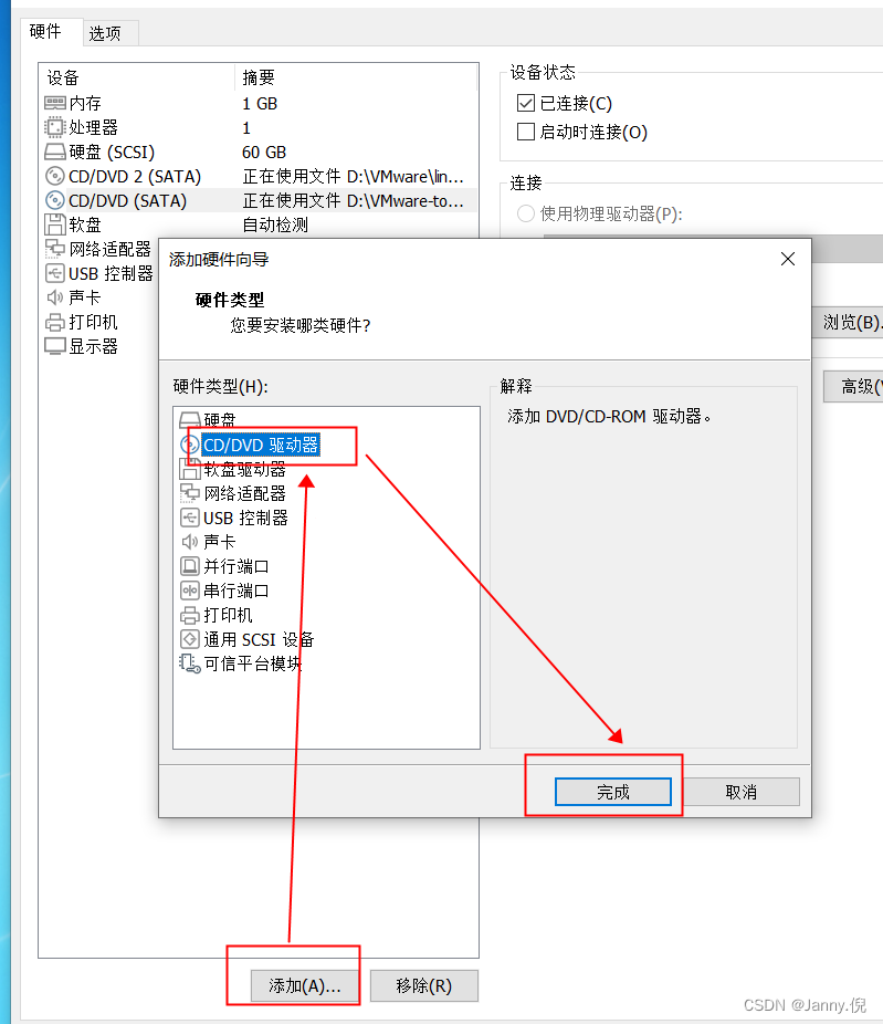 2.点击【添加】,选择“CD/DVD驱动器”,点击完成;