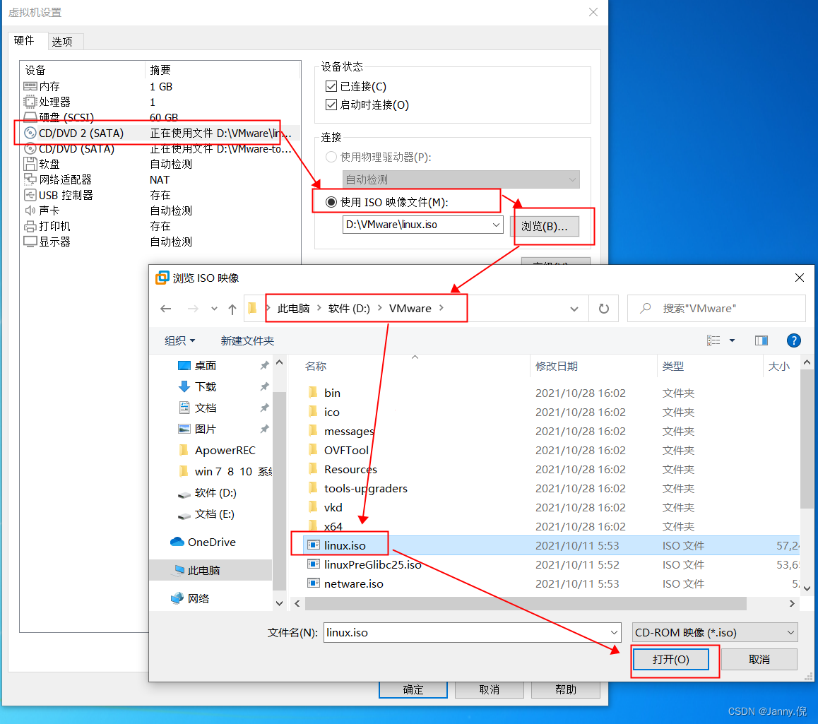 3.选择刚才添加的“新CD/DVD驱动器”,勾选"使用IOS映象文件",点击“浏览”,找到虚拟机安装目录,找到linux.iso文件并选择,点击“打开”,最后点击【确定】即可;
