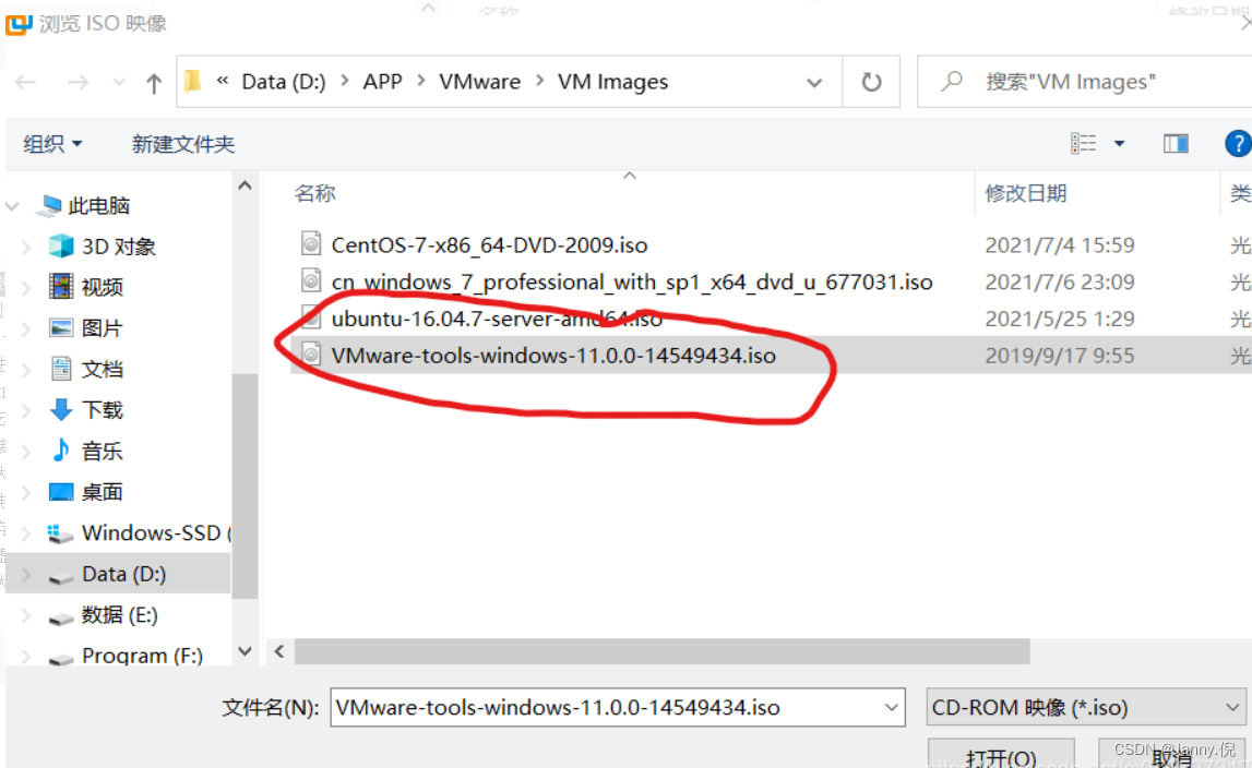 如下图,选择VMware-tools-windows-11.0.0-14549434.iso镜像文件