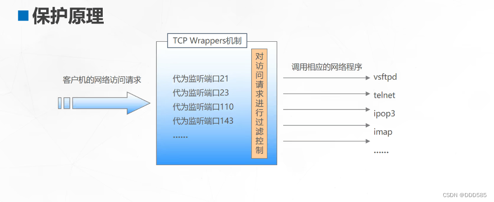 1.直接使用 tcpd 程序对其他服务程序进行保护,需要运行 tcpd 程序。