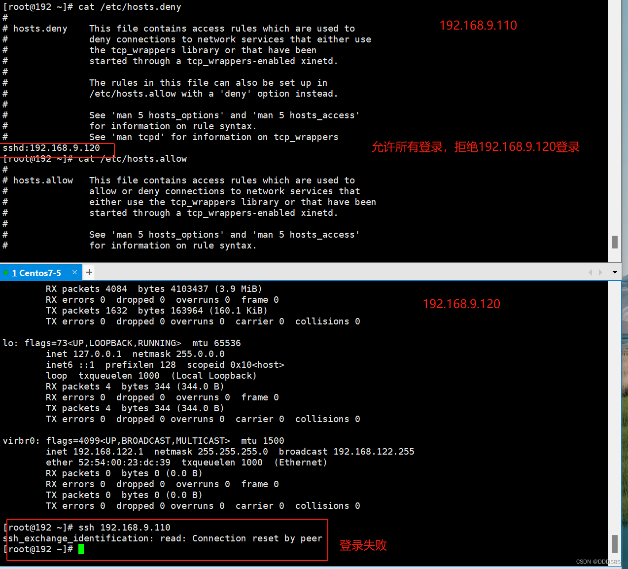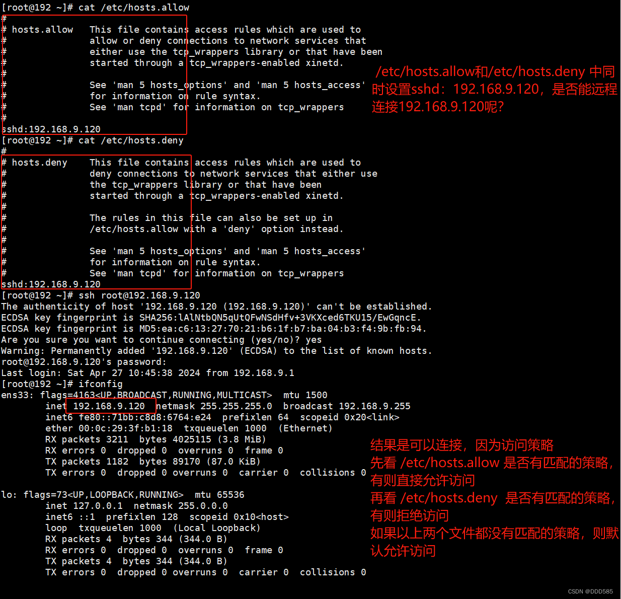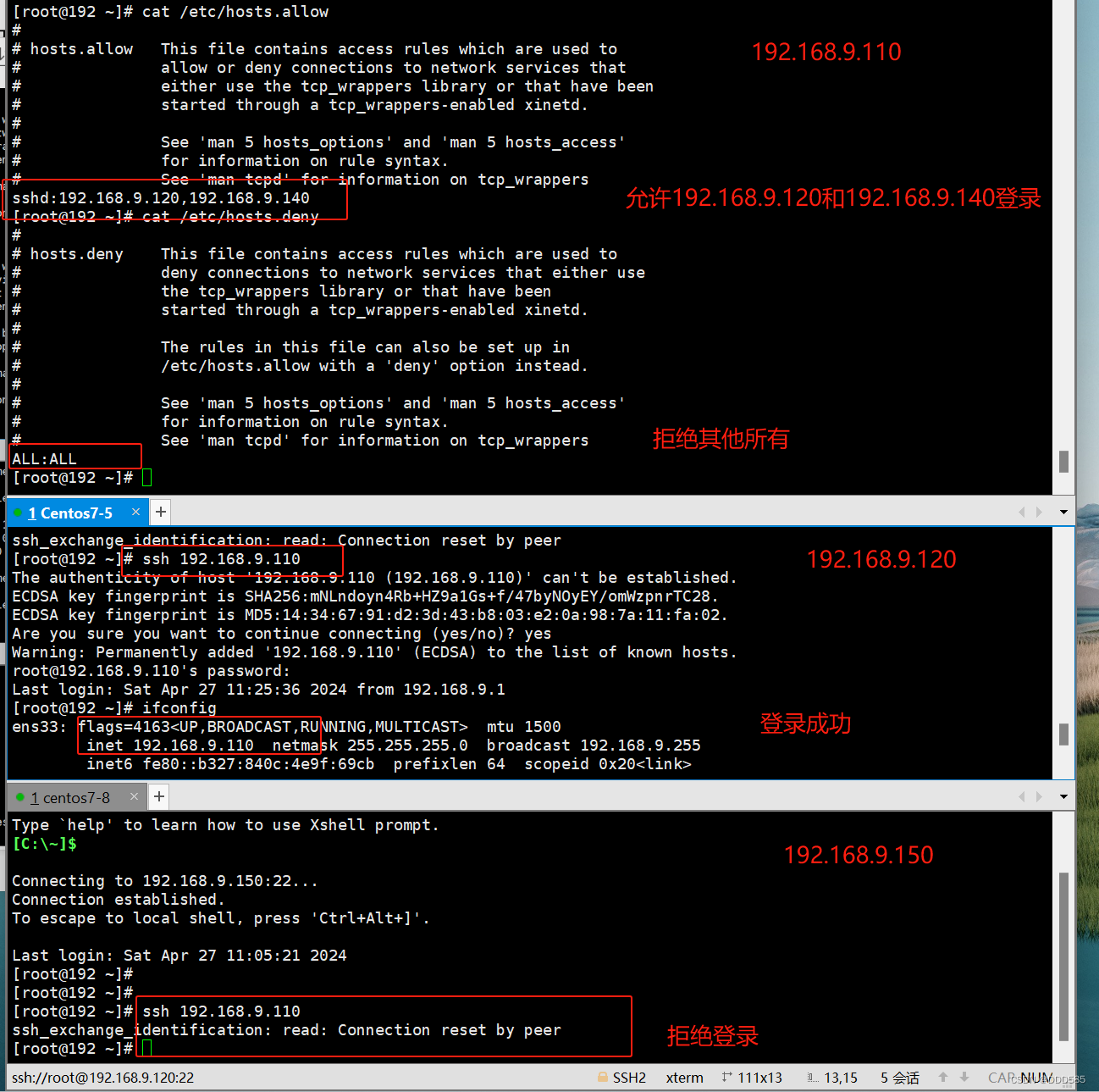 除了在/etc/hosts.allow中添加允许策略之外,还需要在/etc/hosts.deny文件中设置“ALL:ALL”的拒绝策略。