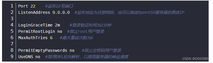sshd服务使用的默认端口号为22,必要时建议修改此端口号,并指定监听服务的具体IP地址,以提高在网络中的隐蔽性。除此之外,SSH协议的版本选用V2比V1的安全性更好,禁用DNS反向解析可以提高服务器的响应速度。