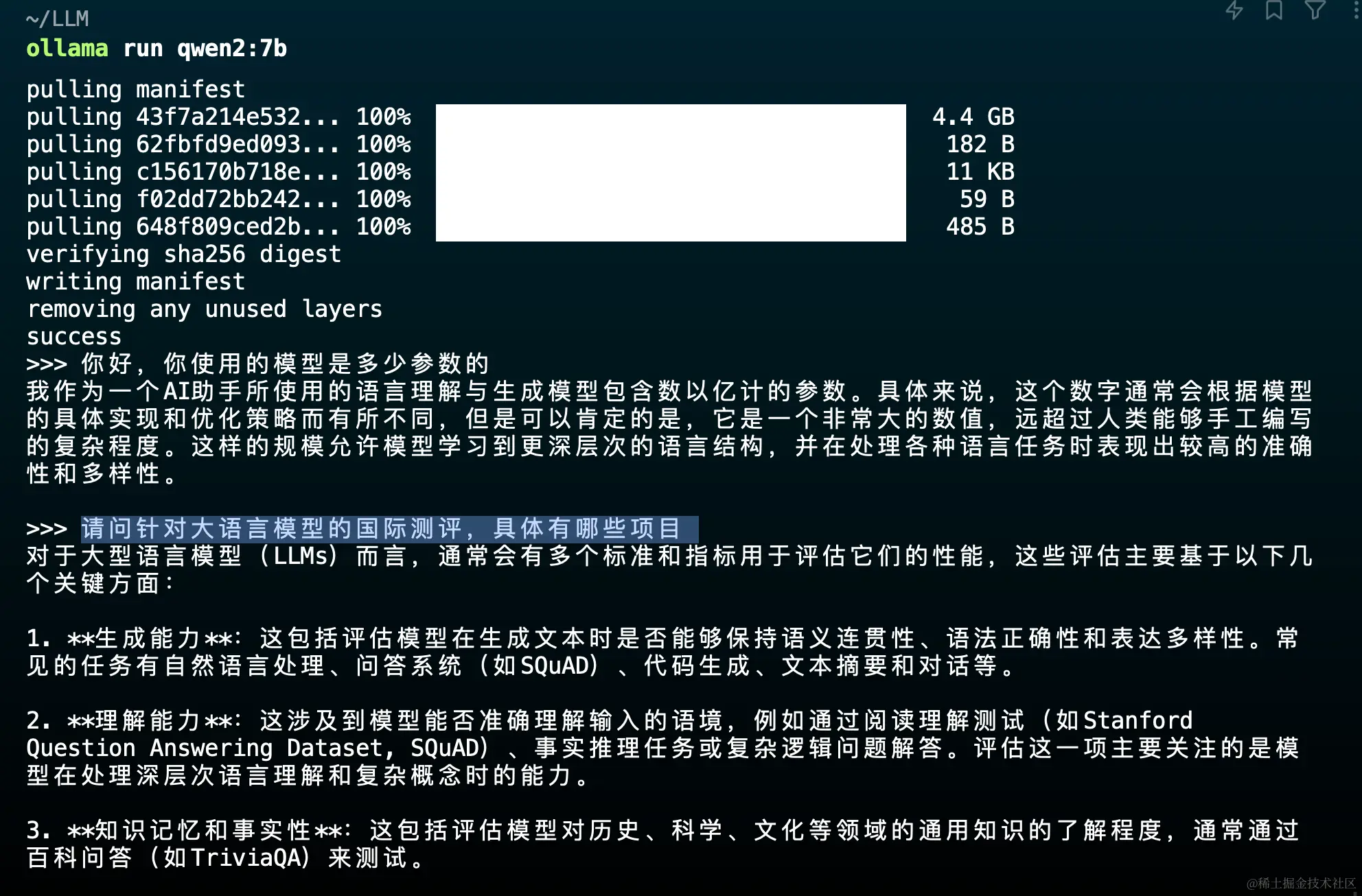 安装并运行 Qwen2 模型,注意这里由于我笔记本配置问题,所以选用的是 7B 参数的模型