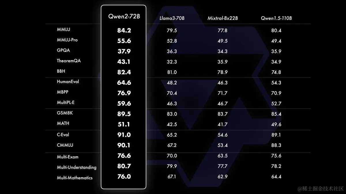 模型在中文、英文语料基础上,训练数据中增加了27种语言相关的高质量数据;增大了上下文长度支持,最高达到128K tokens(Qwen2-72B-Instruct)。多个评测基准上的领先表现;代码和数学能力显著提升。
