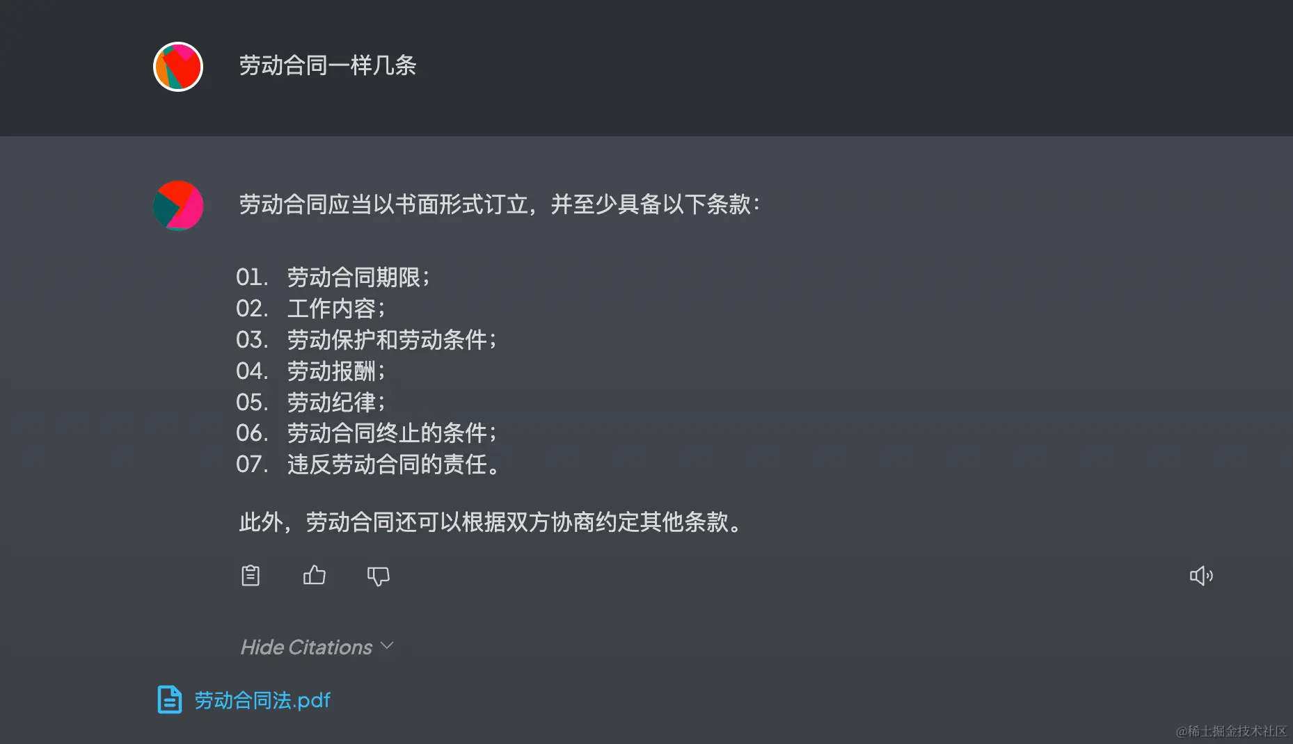 比如我随便上传了一个 《劳动合同法》 的 pdf 文件,用查询模式进行对话: