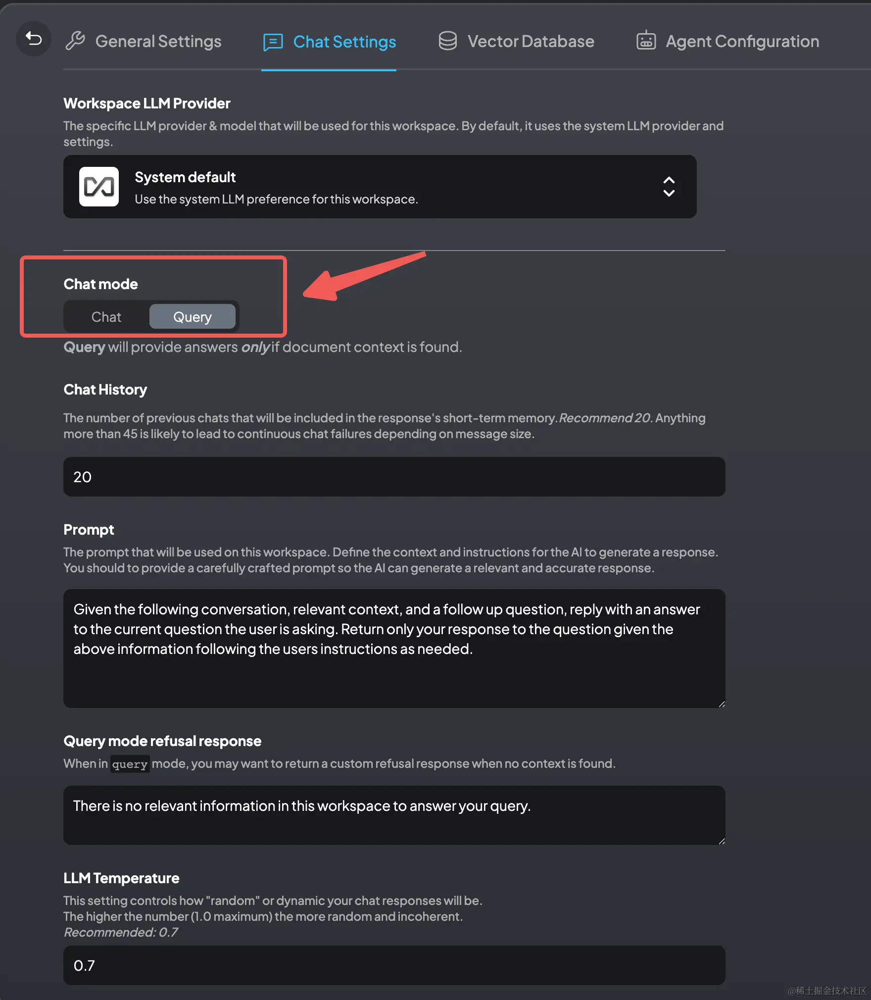 你可以根据项目来创建Workspace,一个项目建一个。然后,把关于这个项目的所有文档、所有网页都导入Workspace。 聊天模式还有两种可以设置: