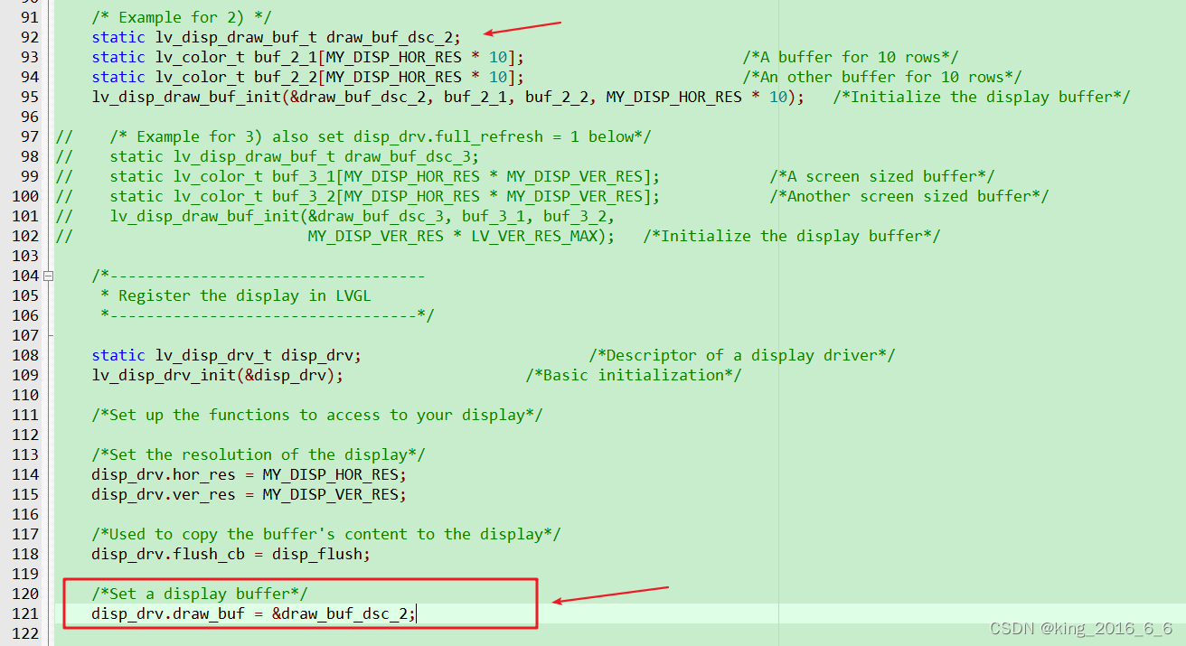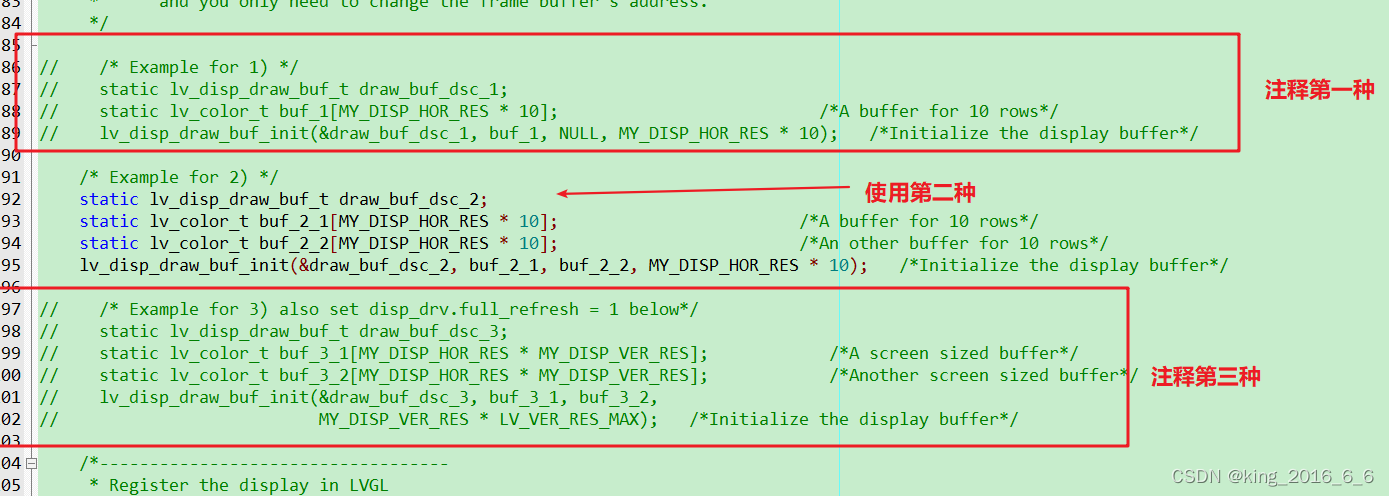 下面这里提供了三中刷屏方式,我们根据自己的硬件资源选择其中一种方式即可,其中第三种方式用到了MY_DISP_VER_RES 我们如果不用第三种刷新方式选择注释掉即可,我这里选择第二种刷新方式,注释掉第一种和第三种凡事如下,