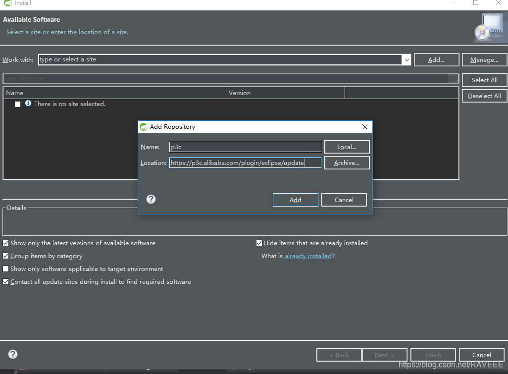 首先通过Help >> Install New Software插件安装菜单,在安装插件的地址栏中输入:https://p3c.alibaba.com/plugin/eclipse/update