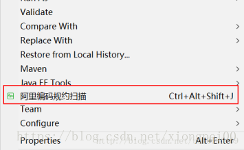 当我们安装完成后,右键菜单中会出现“阿里编码规约扫描”,我们在指定要分析的类、包或者工程上右键