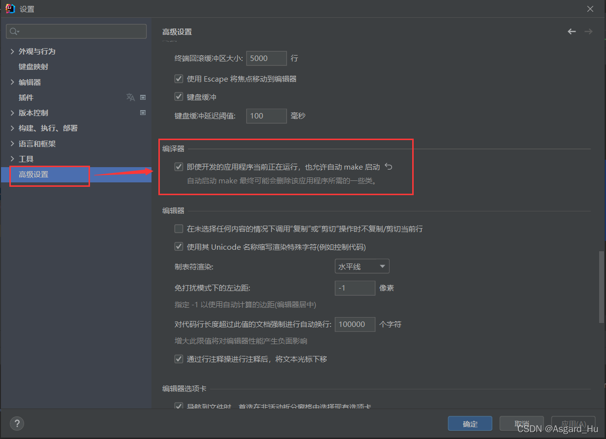在“高级设置”中找到“编译器”,勾选“即时开发的应用程序当前正在运行,也允许自动make启动”
