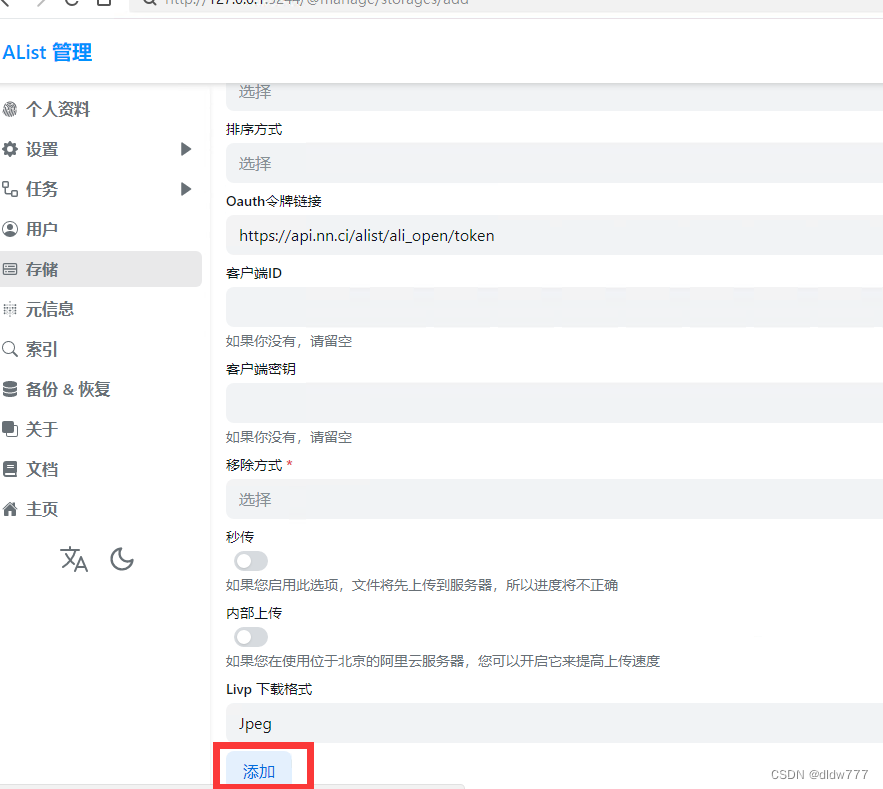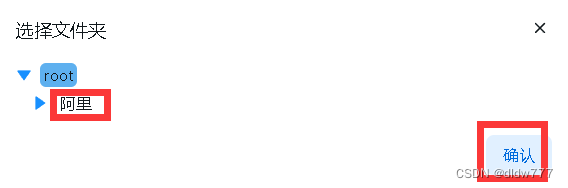 点击选择,找到自己的盘,比如我这里选了个阿里云盘open(这个open和普通的区别在哪我也不懂,但alist说明文件里说推荐用这个)