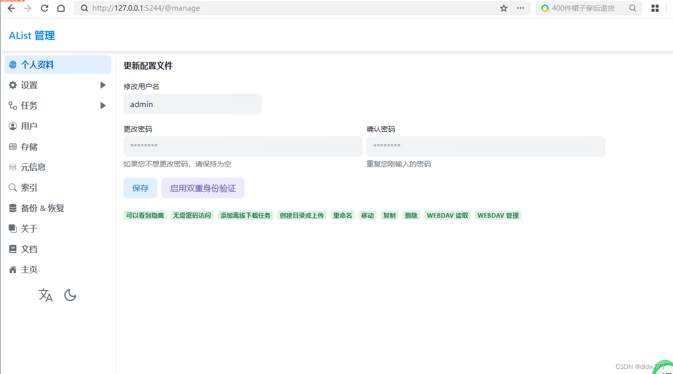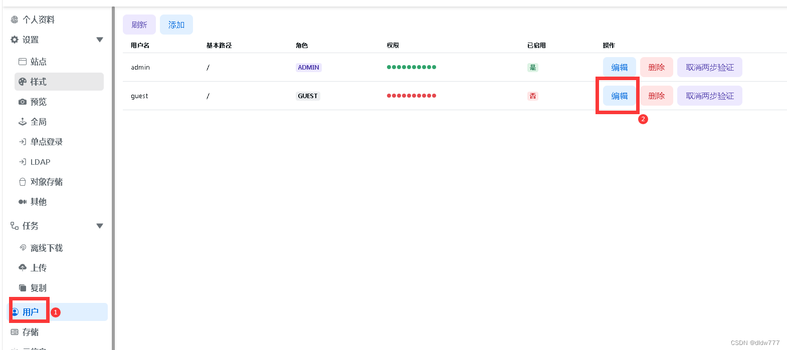 再alist管理界面里找到用户,把guest用户编辑一下权限