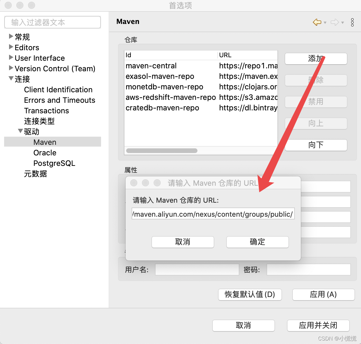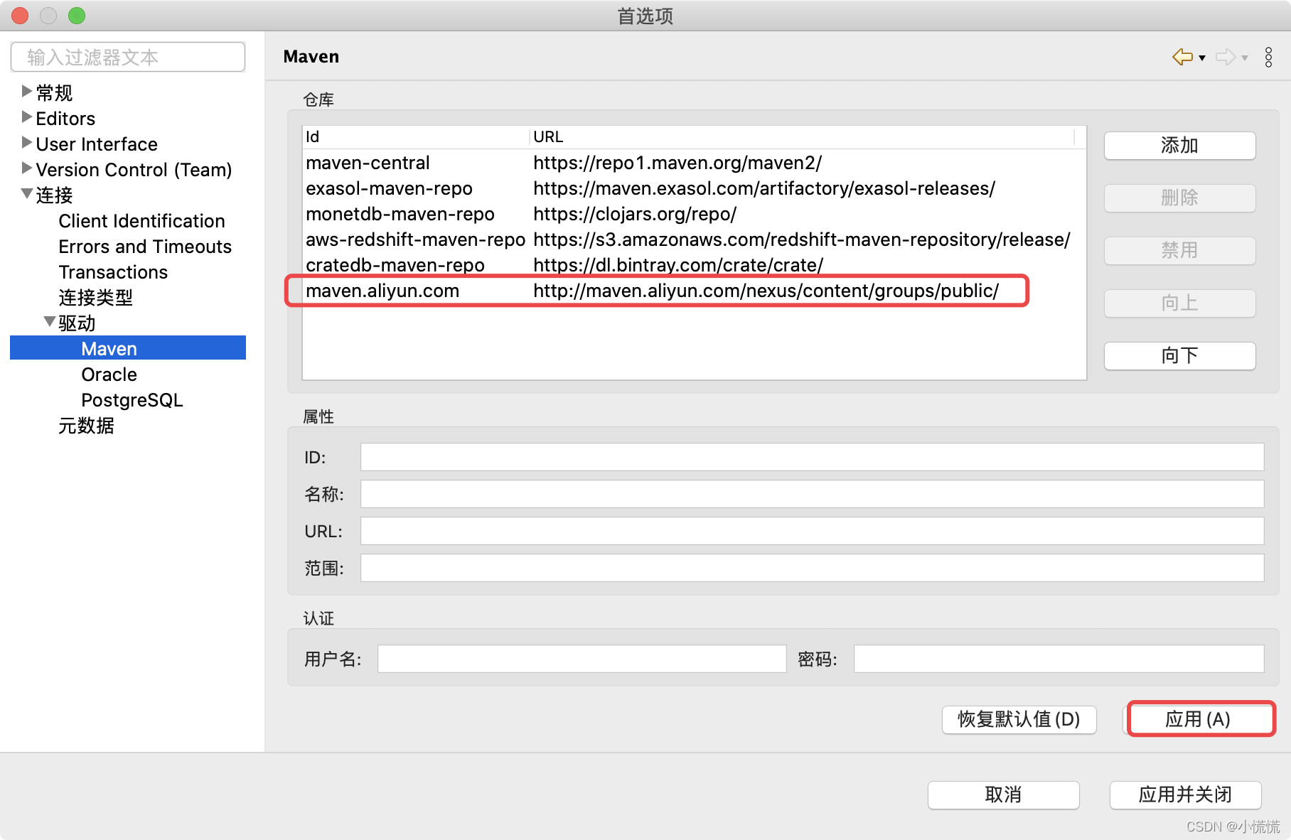 打开“窗口”->“首选项”->“驱动”->“Maven”