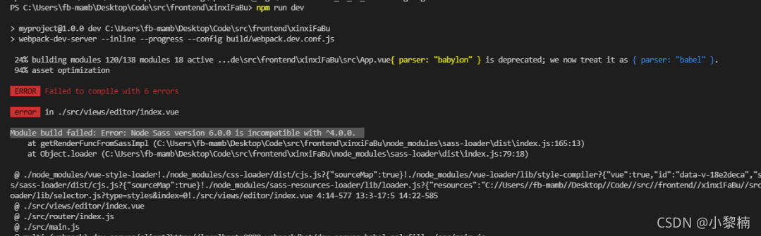 此处报错既是,node-sass与sass-loader的版本兼容问题,解决起来也非常简单!!