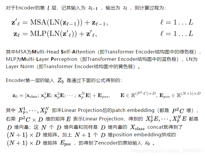 Transformer Encoder结构和NLP中transformer结构基本上相同,所以这里只给出其结构图,和公式化的计算过程,也是顺便用公式表达了之前所说的几个部分内容。