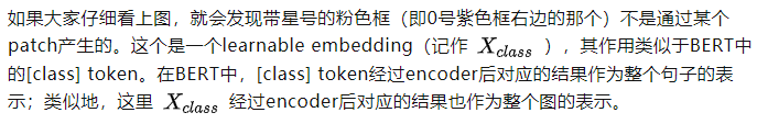 至于为什么BERT或者这篇文章的ViT要多加一个token呢?因为如果人为地指定一个embedding(例如本文中某个patch经过Linear Projection得到的embedding)经过encoder得到的结果作为整体的表示,则不可避免地会使得整体表示偏向于这个指定embedding的信息(例如图像的表示偏重于反映某个patch的信息)。而这个新增的token没有语义信息(即在句子中与任何的词无关,在图像中与任何的patch无关),所以不会造成上述问题,能够比较公允地反映全图的信息。
