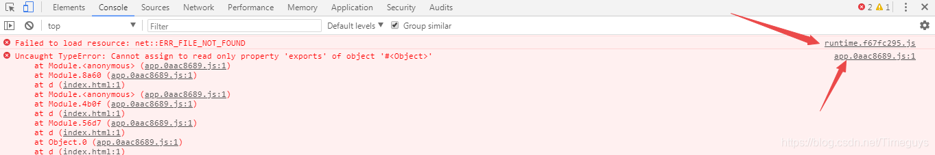 runtime.f67fc295.js Failed to load resource: net::ERR_FILE_NOT_FOUNDapp.0aac8689.js: 1 Uncaught TypeError: Cannot assign to read only property 'exports' of object '#<Object>' 解决方案: https://www.cnblogs.com/qingcui277/p/12244844.html