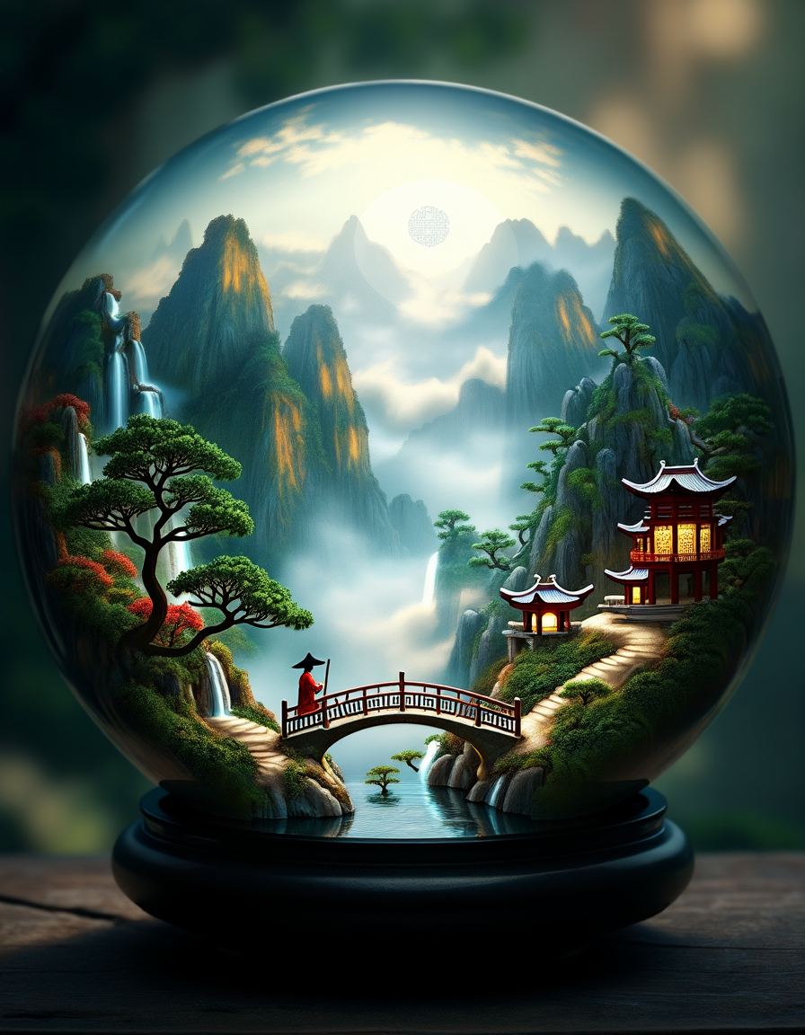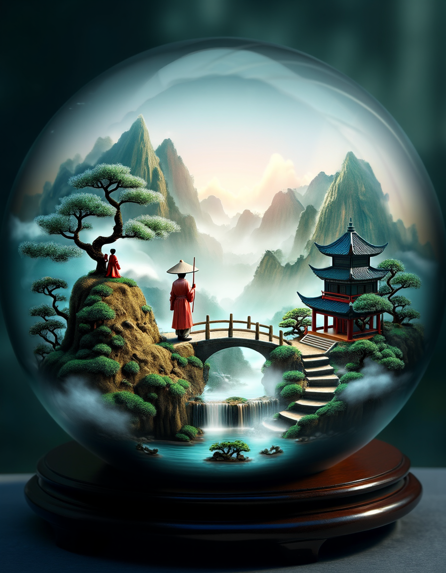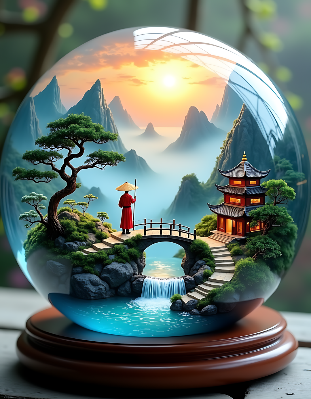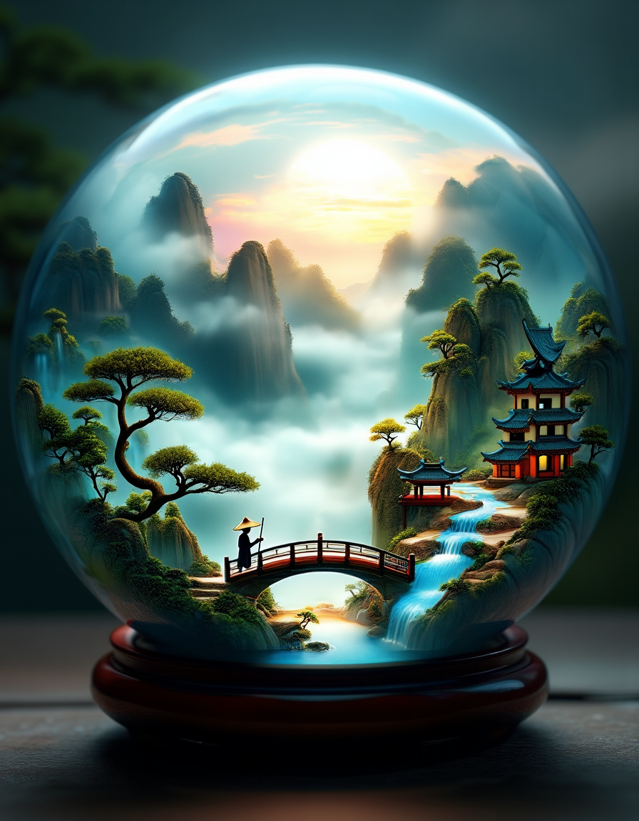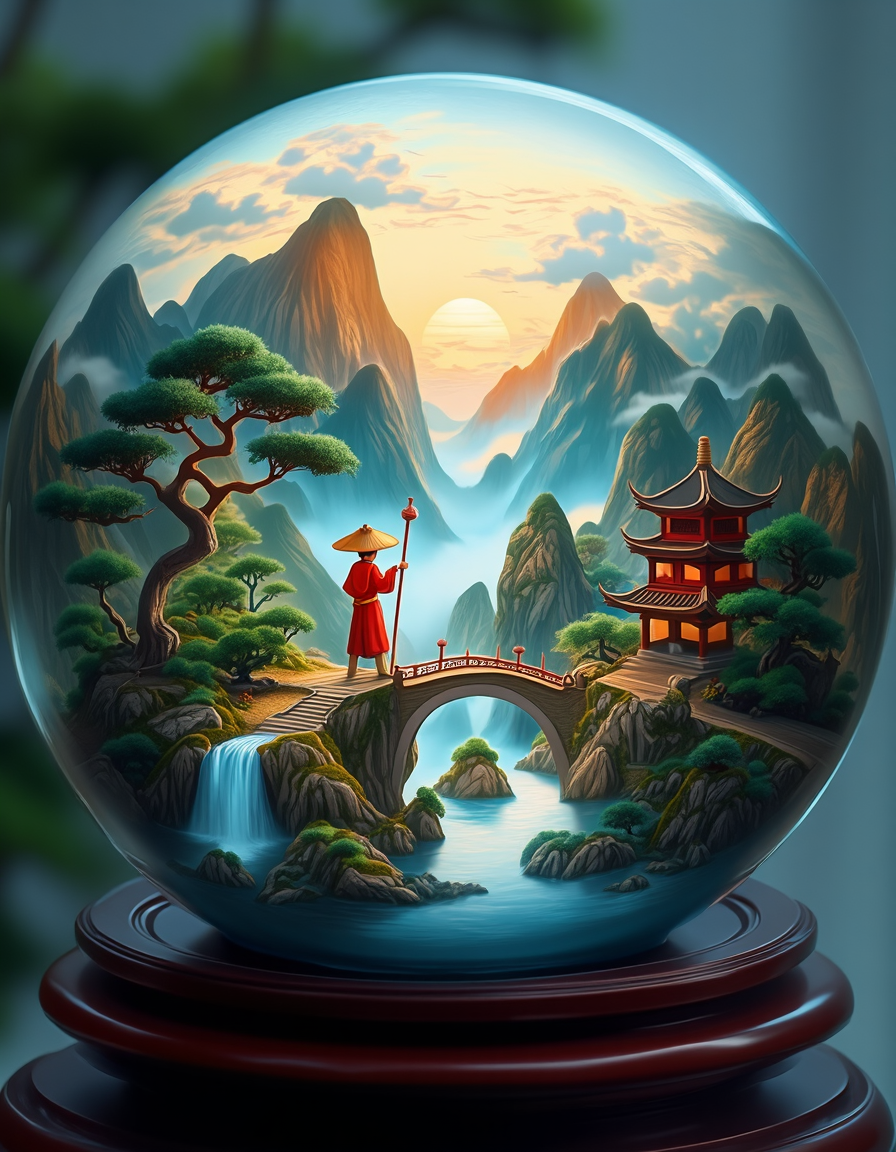 The Chinese landscape colorful garden scenery within a glass ball is enveloped in misty clouds, with captivating light-tracing effects. mountains, water, falls,a small bridge, pavilions, a pine tree greeting visitors, and a figure wearing a conical hat and holding a staff as they ascend the mountain, as well as winding mountain paths. The entire composition presents an exquisite level of detail and aesthetic appeal. The entire scene is set against the backdrop of a pleasing bonsai.