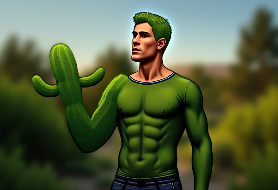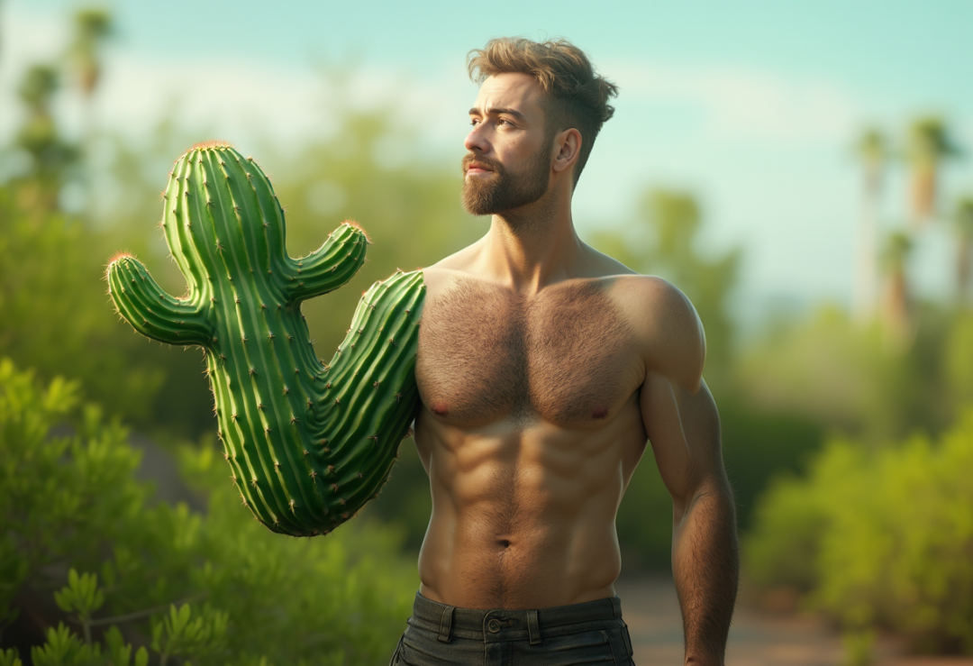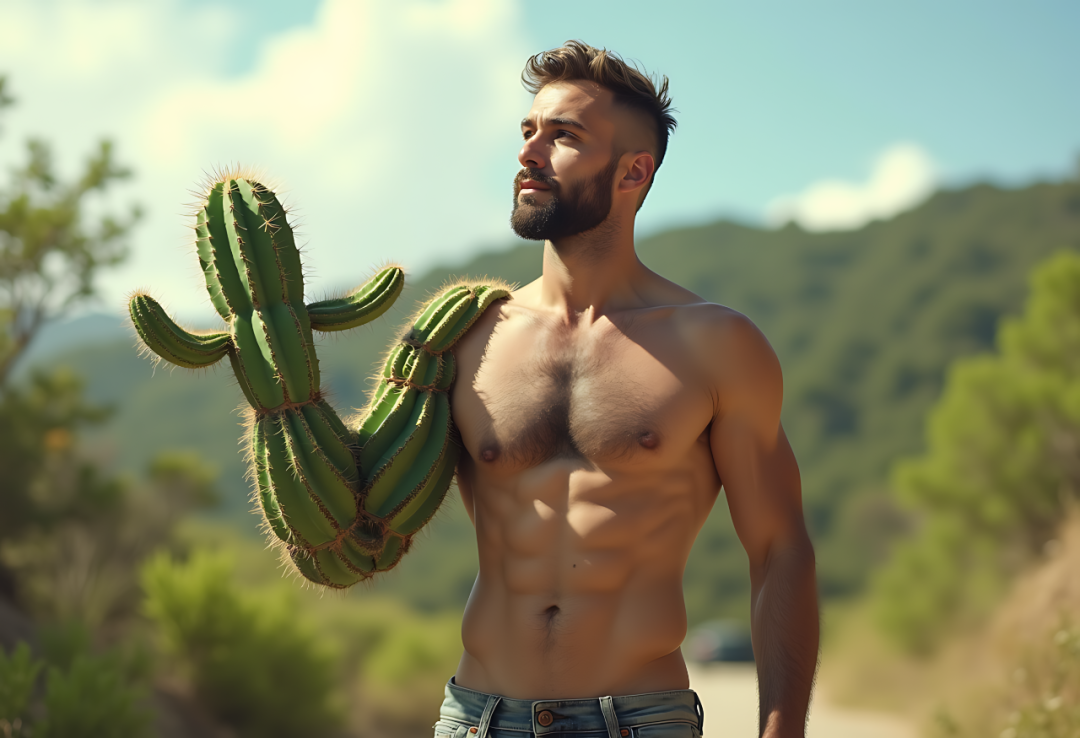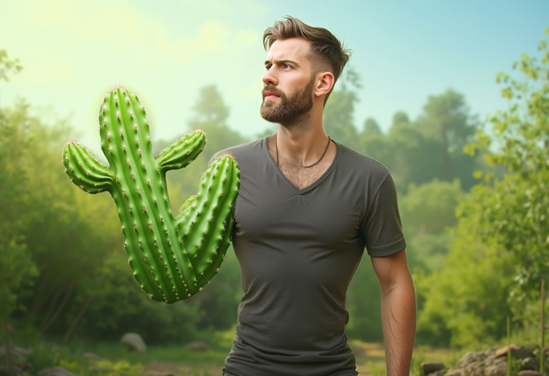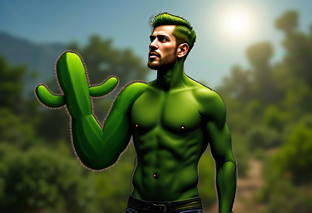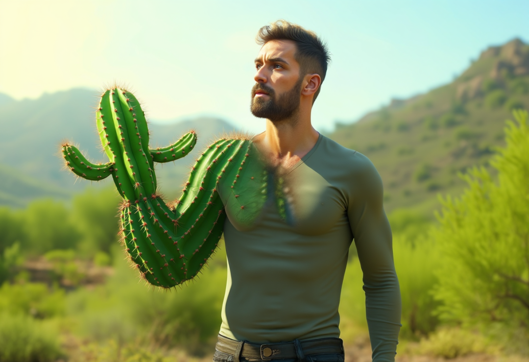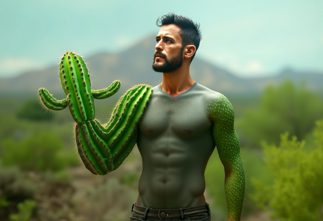 Photorealistic image of a man with a cactus for his arm, only one arm transformed. The man's transformed arm looks like acactus with details. He is standing with his cactus arm visible. The background shows a natural environment with greenery and a bright sky.