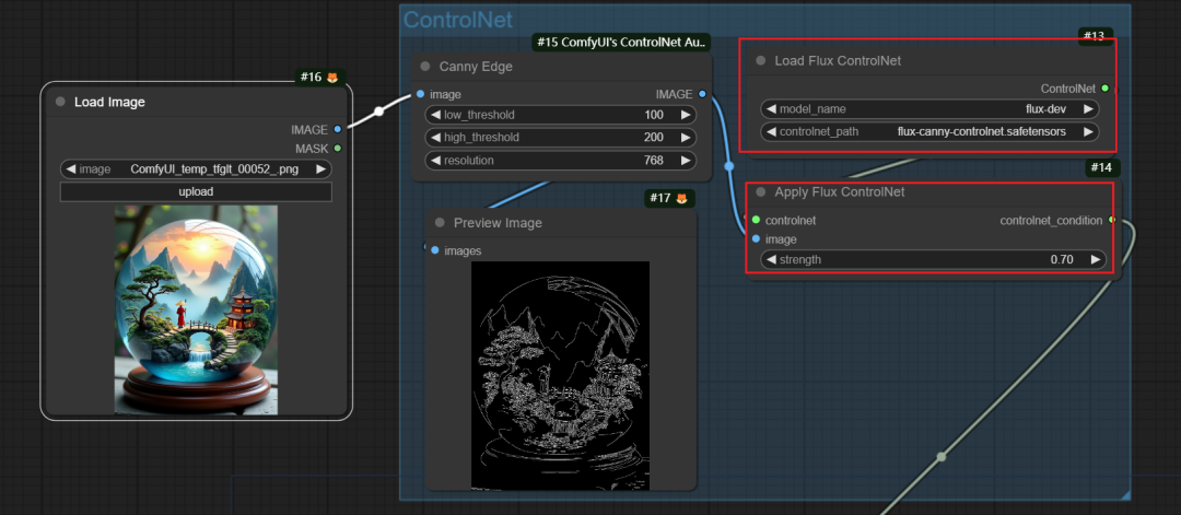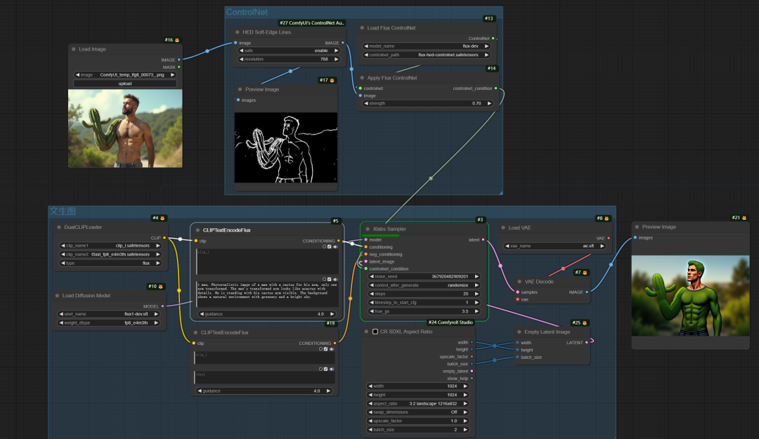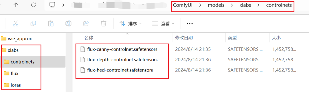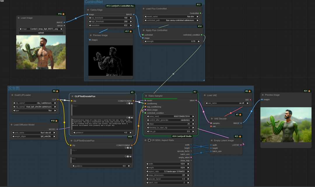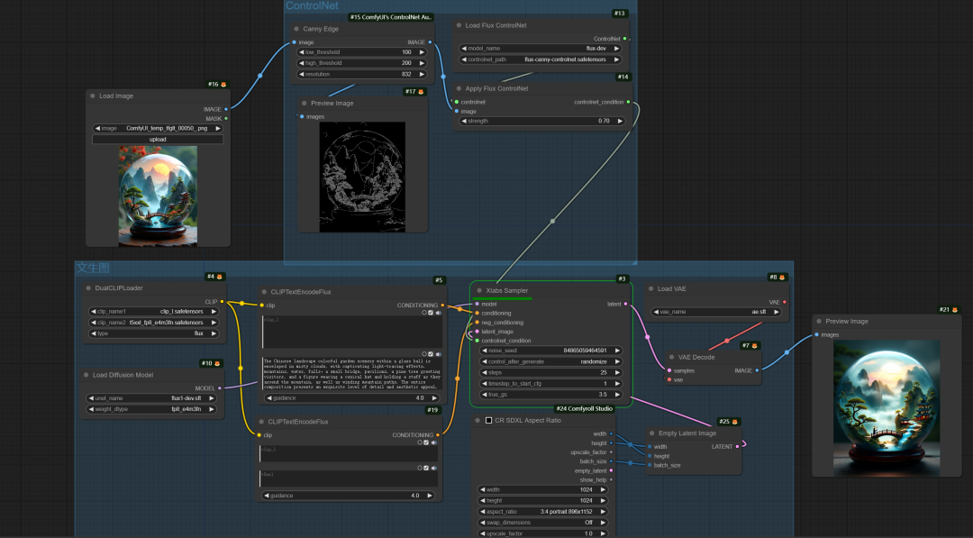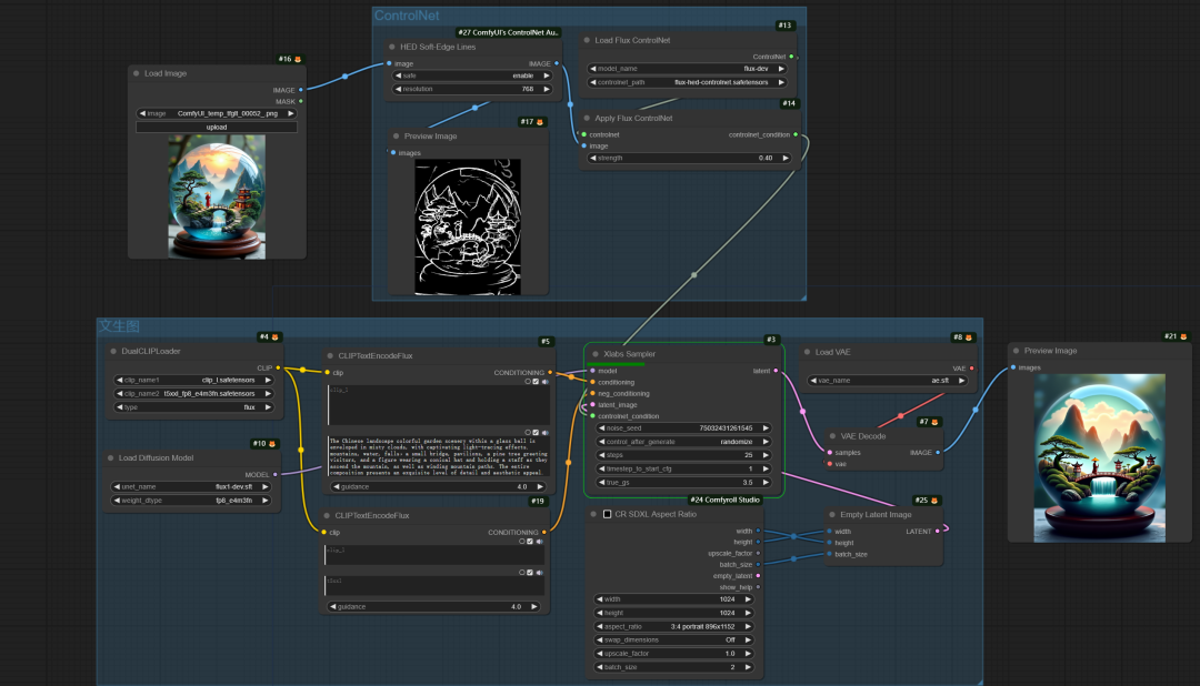 • 该工作流也支持LORA和ControlNet模型运行。需要将模型分别放置到ComfyUI/models/xlabs/loras和ComfyUI/models/xlabs/controlnets目录。