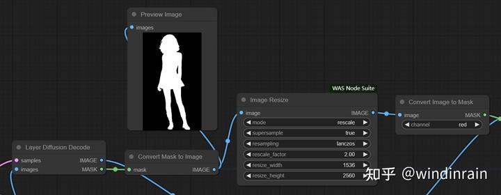 首先通过Convert Mask to Image将蒙版转换成单通道图像,使用Image Resize将单通道图像放大,这里需要注意的是放大后的尺寸必须和原图放大的尺寸一致,否则后期蒙版和原图无法合并。