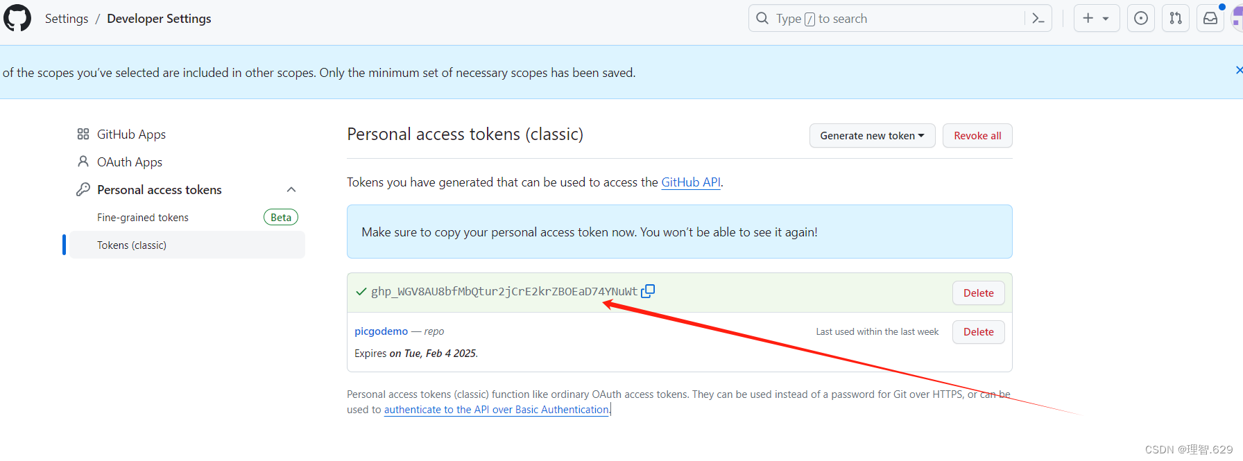 重点来了,复制生成的token(注意:这个token生成后只会显示一次!必须马上复制好,后面要用到)
