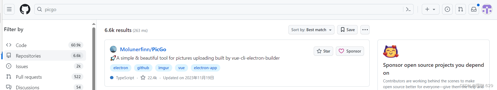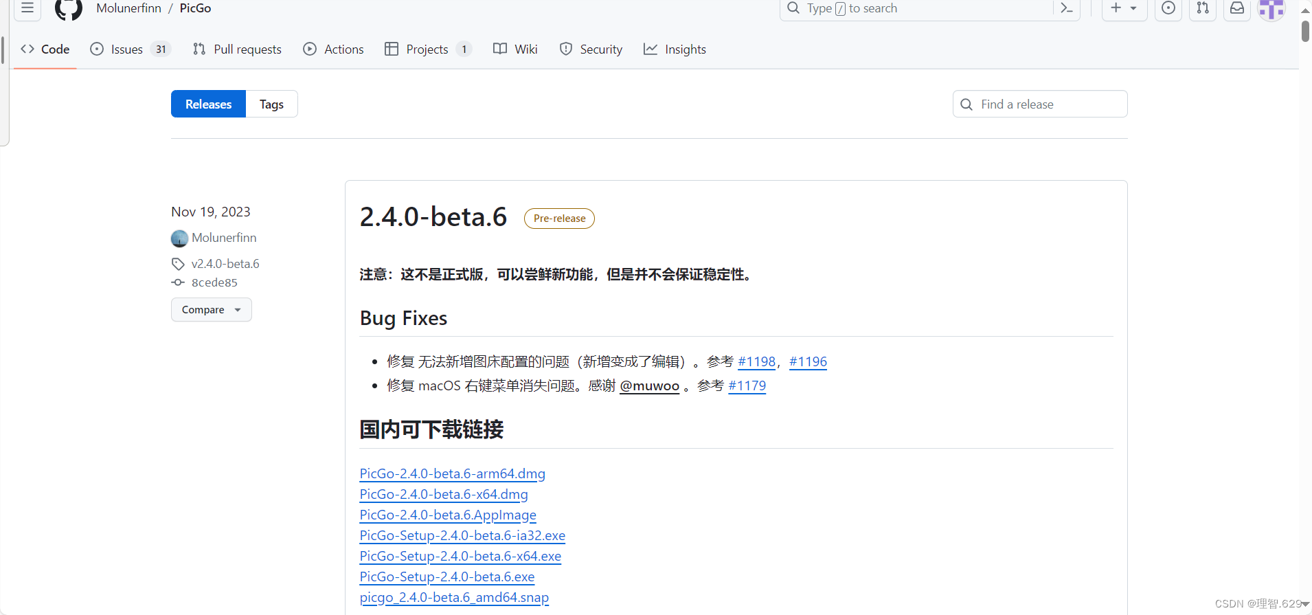 github中搜索picgo,点击进去找到右侧Releases,下载对应的picgo安装包。