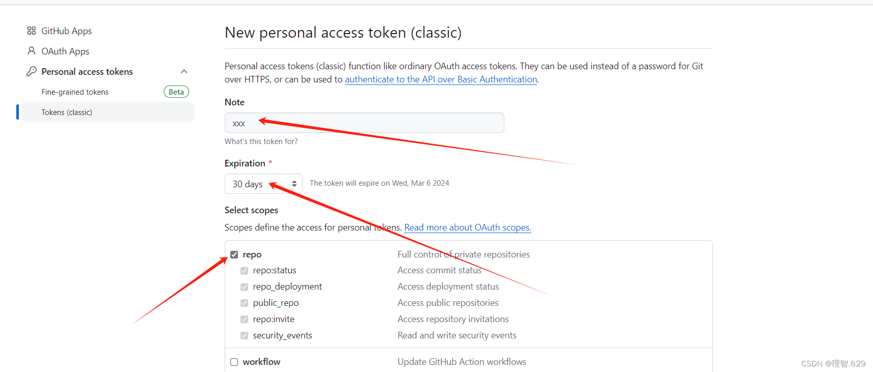 随便填写一个note,设置token有效期,此处勾选repo,拉到页面最下面生成Generate token