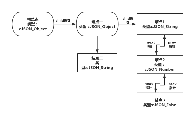 前面提到过,cjson的存储结构像一个广义表,其实也可以说是一个树,不过兄弟结点之间都通过prev和next两个指针连接起来。