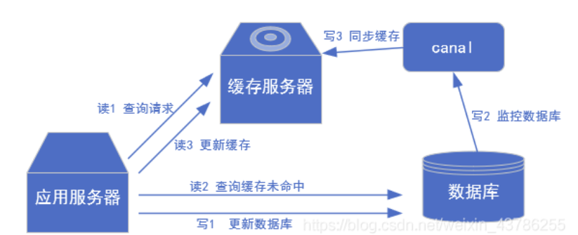 (2)更新缓存:如果有大量的请求发送到mysql的话,mysql查询速度慢,QPS上不去,光查mysql可能会瘫痪,那就可以在前面加个缓存,这个缓存有2个主要的问题。一是缓存没有怎么办,二是数据不一致怎么办。对于第一个问题查缓存没有就查询mysql,mysql再往缓存中写一份。对于第二个问题,如果数据库修改了,那就采用异步的方式进行修改,启动一个canal服务,监控mysql,只要一有变化就同步缓存,这样mysql和缓存就能达到最终的一致性;