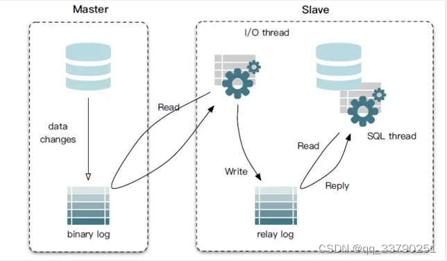 MySQL master将数据变更写入二进制日志(binary log,其中记录叫做二进制日志事件binary log events,可以通过 show binlog events 进行查看)