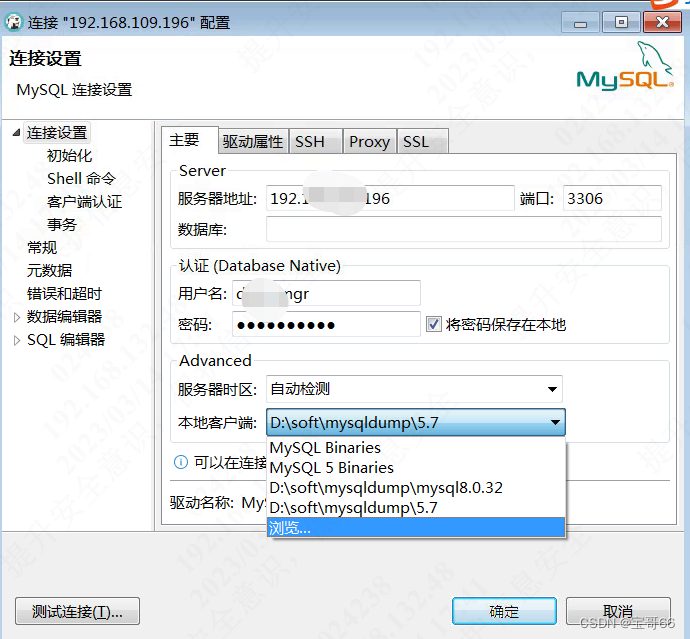 配置客户端入口有多个,上图中的三个功能到最后一步,如果没有客户端就会自动触发网络下载。无网络环境就会报错。所以到最后一步需要手动配置,再点继续。或者选中数据库》编辑连接》本地客户端》浏览。