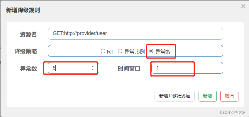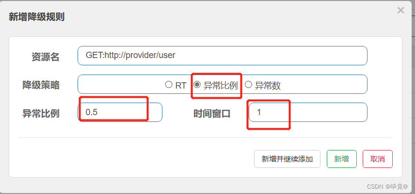 (3)异常比例策略关注的是服务请求中异常的比例,当异常比例超过阈值时,认为服务不可用,触发熔断保护。