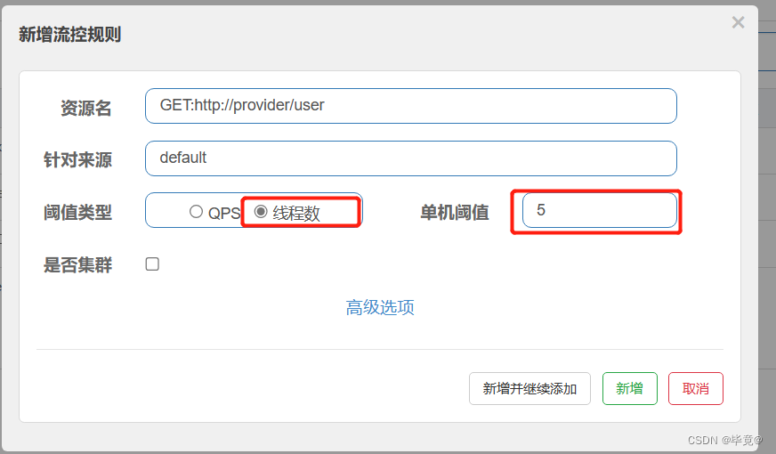 上图表示的是:给provide/user接口设置流控规则,线程数不能超过5。