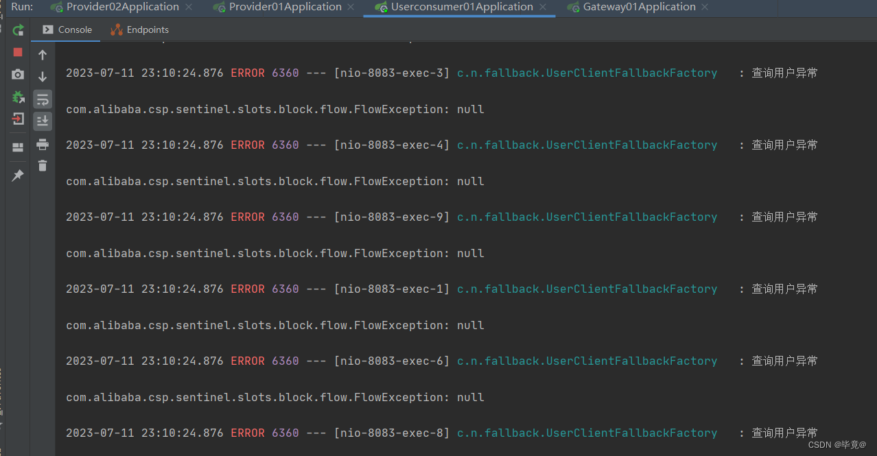 UserClientFallbackFactory需要继承的是 FallbackFactory并且里面的参数是我们的FeignClient远程调用的接口UserClient,然后需要重写我们FallbackFactory里面的create方法,并且抛出异常,我们这里利用@Slf4j的log.error()方法在控制台输出这个异常。还需要加上Component注解给该类的方法创建bean对象,以便可以被调用。
