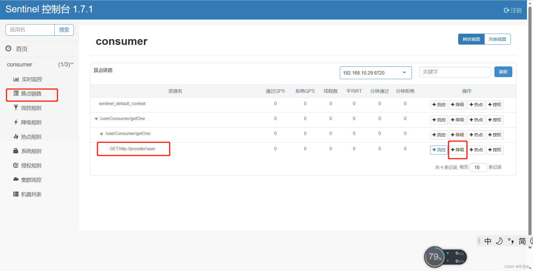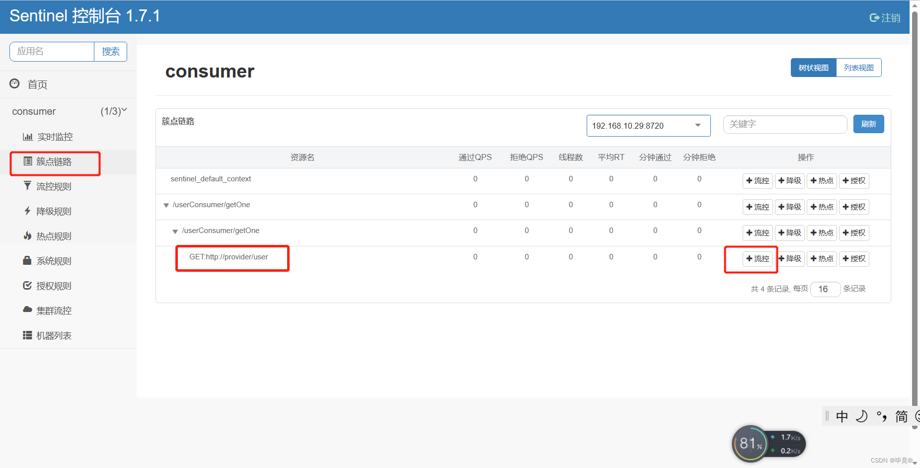 在Sentinel控制台里的簇点链路,选择自己的资源名,点击流控