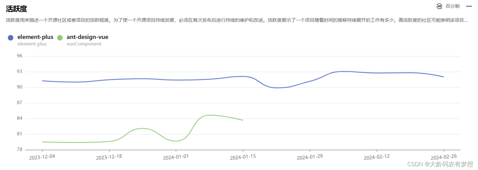 活跃度用来描述一个开源社区或者项目的活跃程度。为了使一个开源项目持续发展,必须在首次发布后进行持续的维护和改进。活跃度展示了一个项目随着时间的推移持续展开的工作有多少。