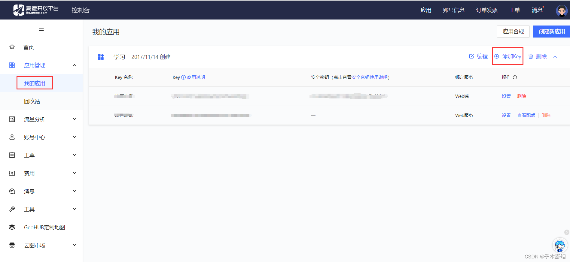 1.在高德地图开放平台,注册登录成为开发者,在控制台,我的应用,添加KEY,得到安全秘钥;