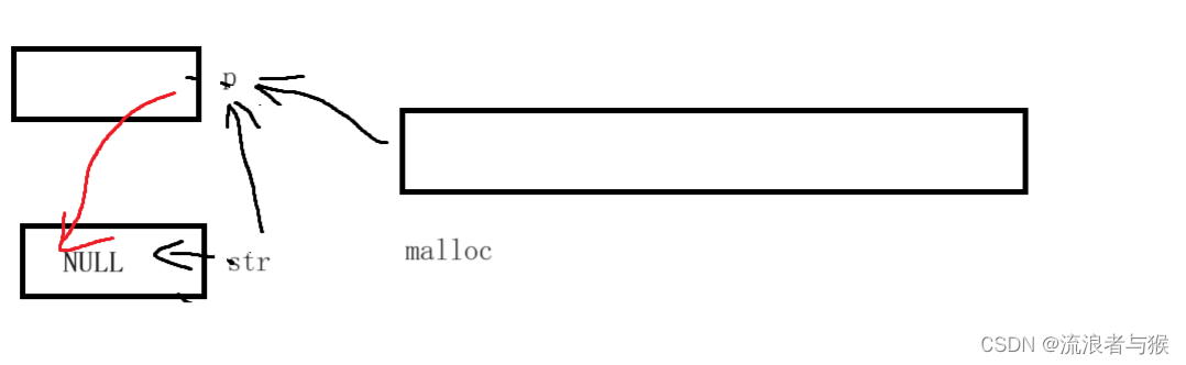 我们在把 str 传给GetMemory这个函数,并用字符指针 p 来接收,p指向的也是NULL,然后接下来往后看,malloc开辟一块内存空间,p来接收,这时p指向的是malloc开辟空间的这个地址,而不是NULL