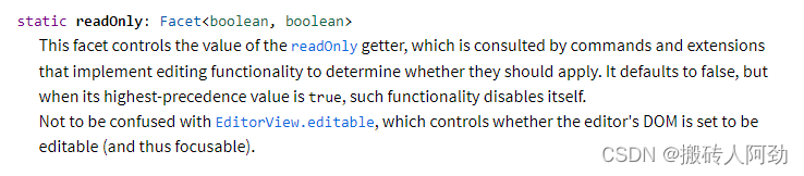 最后一段中说了Not to be confused with EditorView.editable, which controls whether the editor's DOM is set to be editable (and thus focusable).
