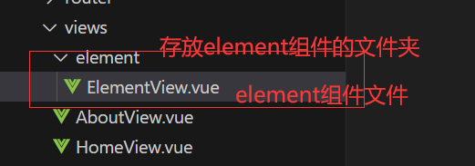 1.在Vue项目中的views中创建一个element文件夹,用来存放element组件