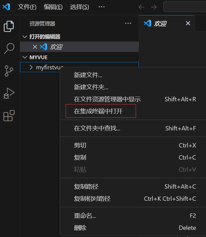 如果没有出现“在集成终端中打开”的选项,说明导入到Vscode的文件夹不是完整的Vue文件夹项目